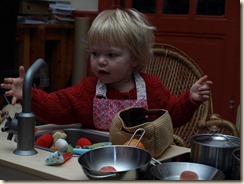 Tussen al dat koken, eten serveren en zelf eten (ze at opvallend goed vandaag) door, gingen we toch even spelen in de sneeuw. Elena leek daar echter niet zo fel van te genieten. Telkens opnieuw vroeg ze me: ‘Pakken’ (oppakken, optillen). Dus gingen we maar weer naar binnen waar ze het overgrote deel van de dag verder druk in de weer was met haar keukentje. Je merkt hoe ze haar verbeelding gebruikt: er loopt geen water uit de kraan, maar zij draait eraan, zegt: ‘Psscht, psscht’ en spoelt de stoffen tomaten, sla, komkommer en prei onder denkbeeldig water; de marsepeinen vruchtjes waren allemaal “tomaten” die ze “klaarmaakte” in een van haar kookpotjes. Ze proefde ervan en leek voor een keer die zoetigheid niet zo slecht te vinden. Op een zeker ogenblik bereidde ze twee marsepeinen “tomaten” tegelijk en toen ik daarna voorstelde om samen even naar tekenfilms te kijken (weer opdat ikzelf even zou kunnen uitrusten, want Elena is onvermoeibaar en eist van ons hetzelfde), merkte ik dat ze in elke hand een marsepeintje meebracht, waar ze afwisselend aan likte of aan knabbelde. Later zou ze een heel kookpotje vullen met die vruchtjes!